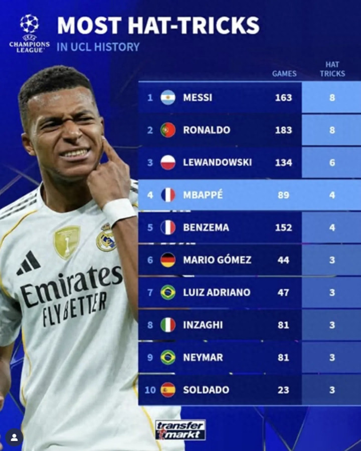 北京时间10月1日凌晨,在欧冠联赛阶段第二轮的比赛中,皇马远征克服长途飞行的疲惫,客场5-0大胜阿拉木图凯拉特,其中首发出战的法国前锋姆巴佩上演了帽子戏法,这让姆巴佩的欧冠戴帽次数来到了4次,在欧冠历史戴帽次数榜上升至并列第四。